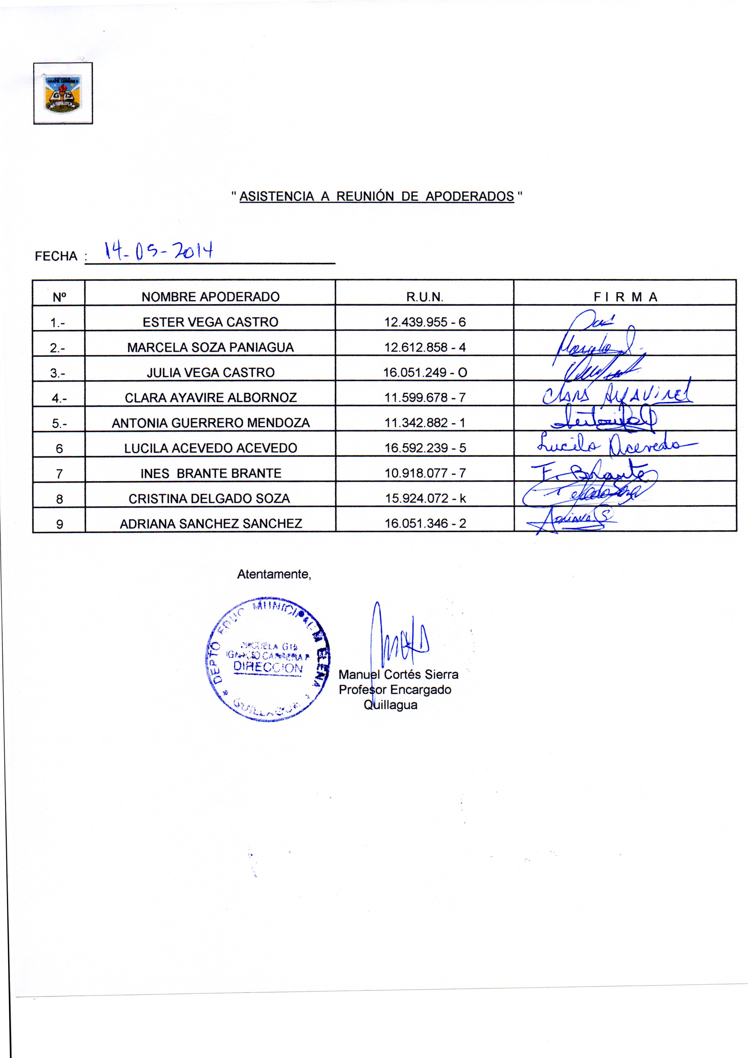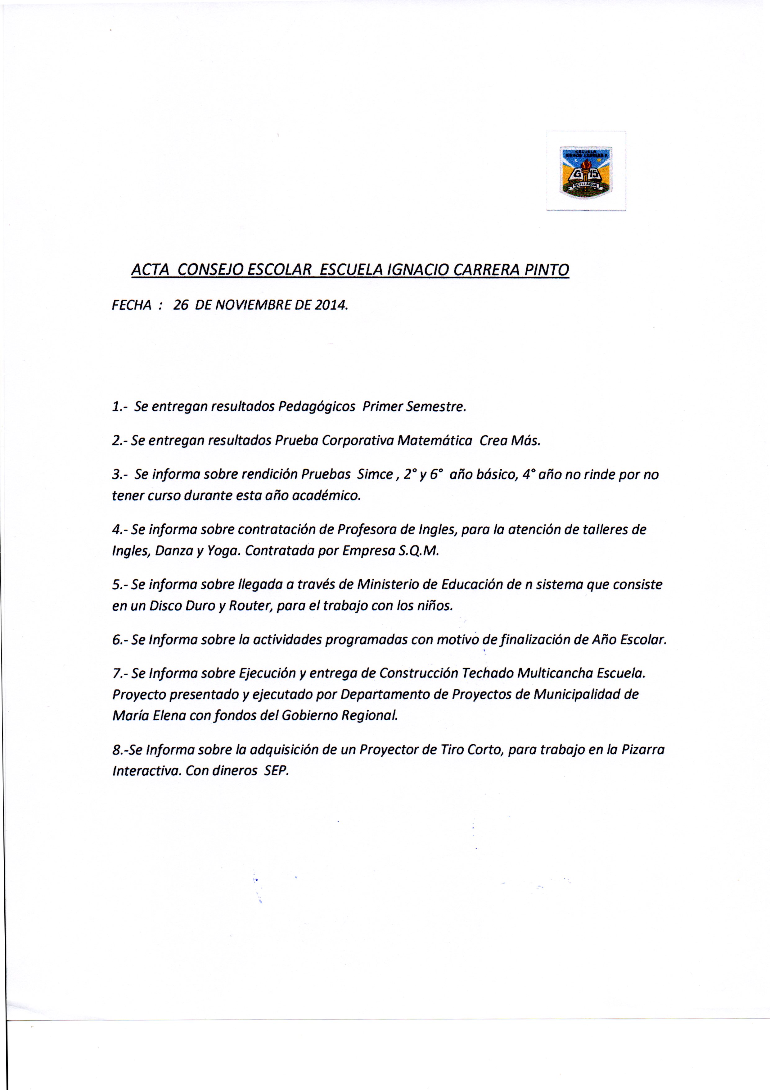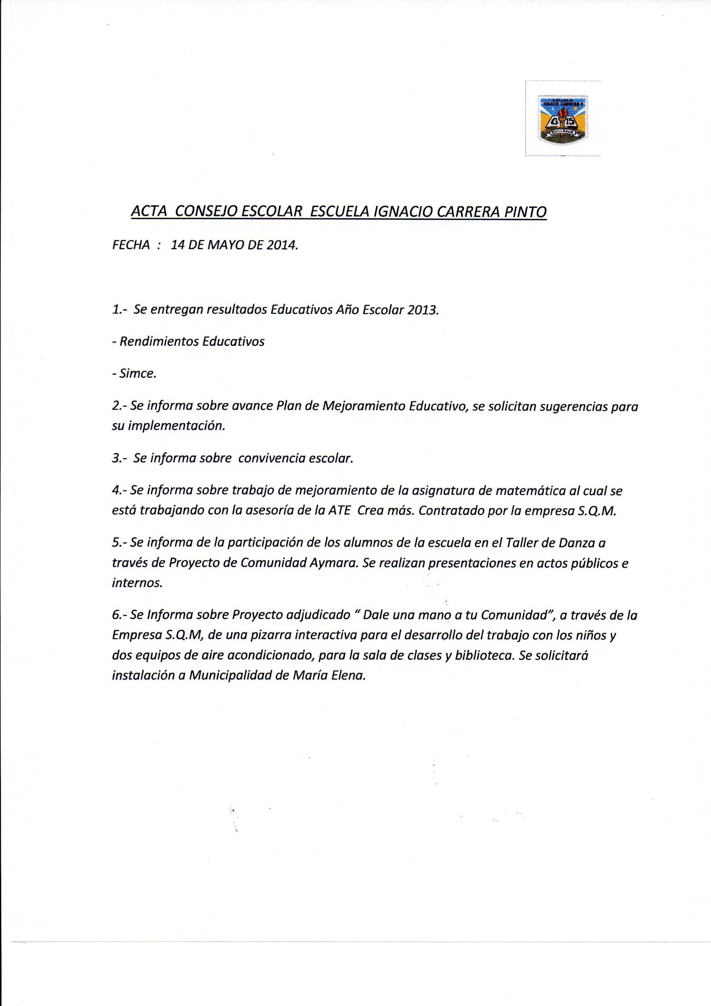 Transparencia Activa » 1.10 Mecanismo De Participación Ciudadana» Mecanismo de Participación» Actas de Consejo Escolar » 2014» Escuela G-15 Ignacio Carrera Pinto, Quillagua